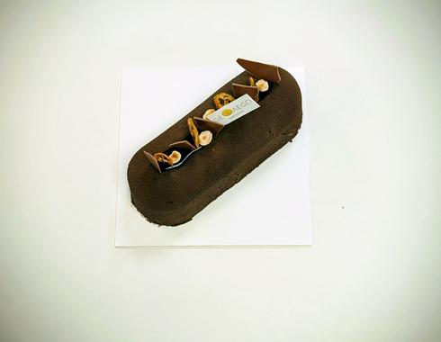 hazelnoot cremeux, karamel en chocolade mousse. Afgewerkt met brownie